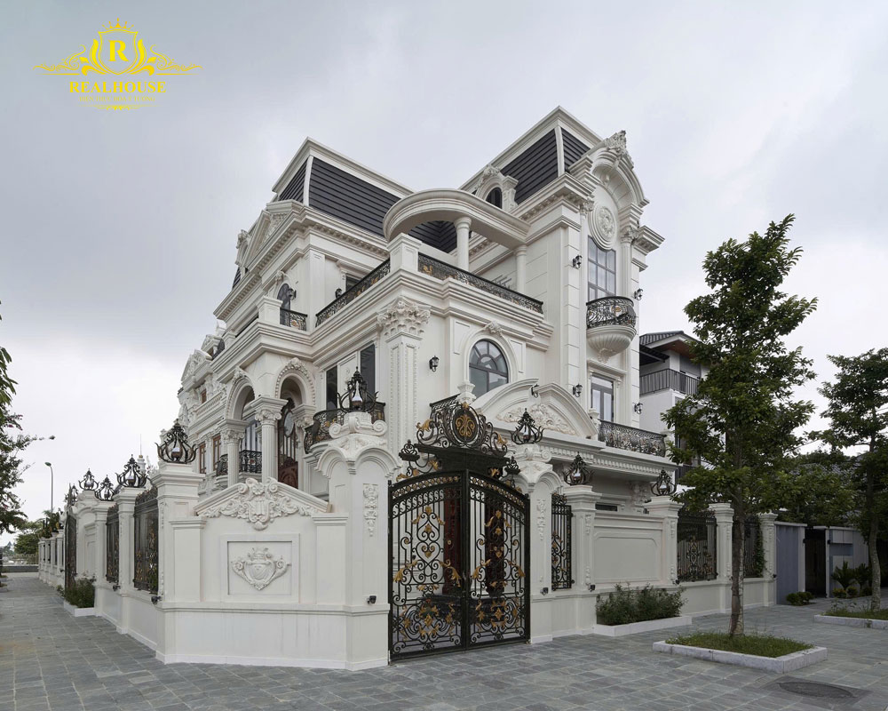Căn biệt thự hoàn hảo bắt đầu từ cái nhìn đầu tiên. Với dự án biệt thự tại Thanh Hóa, Real House đã lựa chọn thiết kế theo phong cách tân cổ điển Pháp với tông màu trắng sứ chủ đạo. Điểm nhấn của ngoại thất nằm ở hệ mái Mansard xanh đen quyền lực, kết hợp cùng những đường phào chỉ chạy dọc thân nhà một cách thanh thoát nhưng đầy uy nghiêm.
