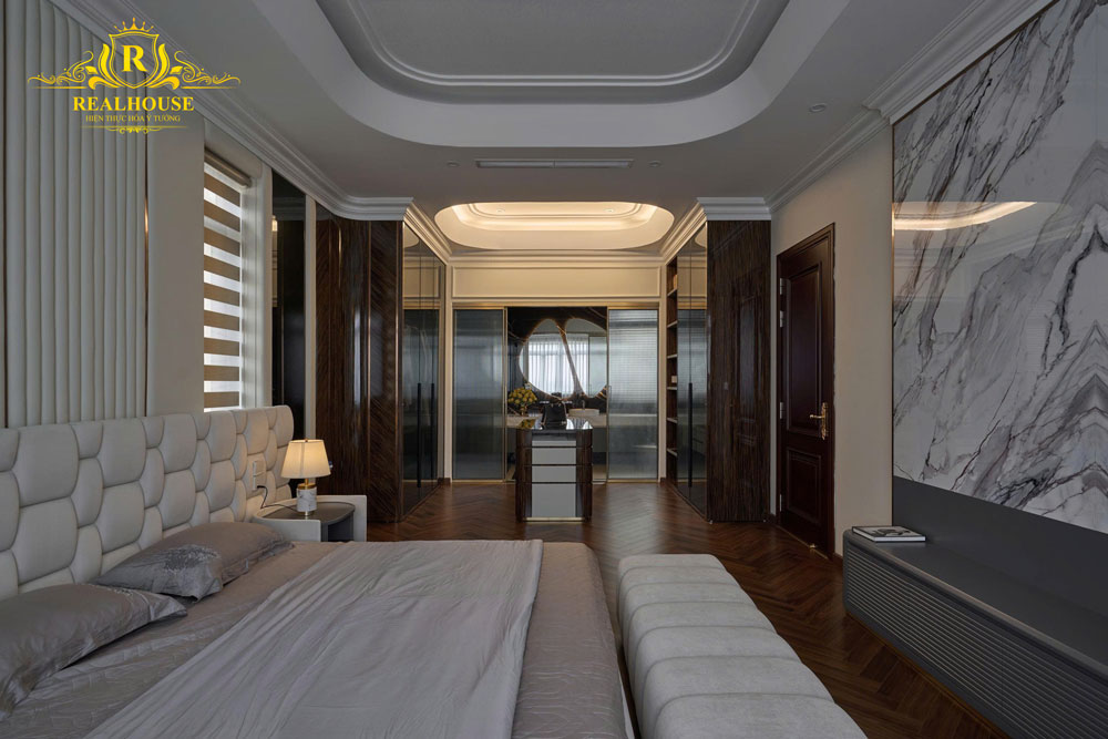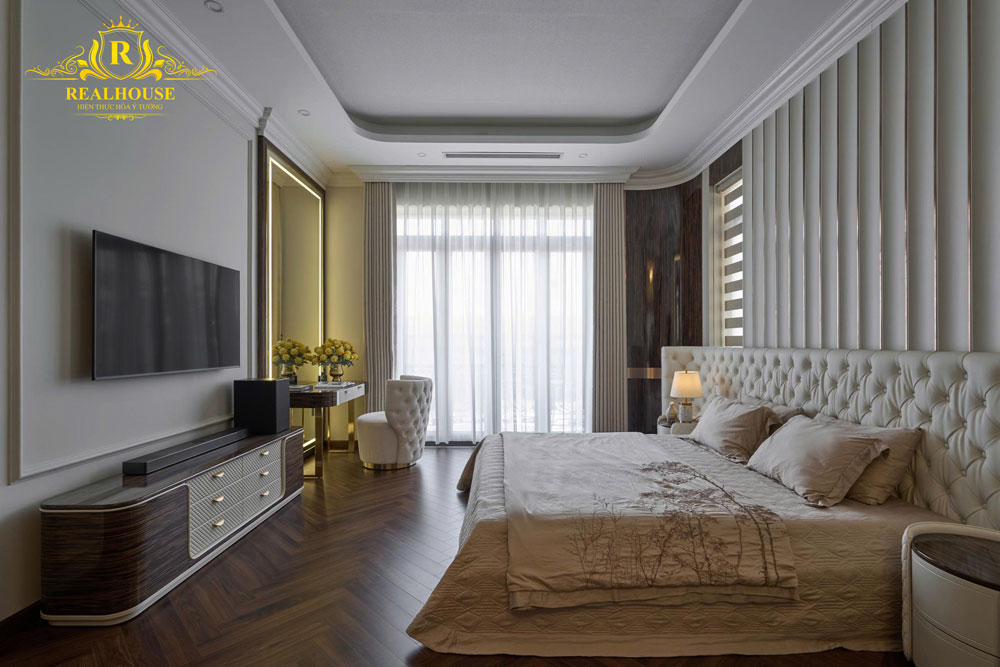 Sau khi hoàn thiện concept, Real House tiếp tục triển khai chi tiết từng hạng mục như vật liệu, màu sắc, ánh sáng và bố cục nội thất. Tất cả đều được tính toán kỹ lưỡng để tạo nên một tổng thể liền mạch, đúng tinh thần tân cổ điển sang trọng. Từ phòng khách thông tầng cho đến không gian riêng tư như phòng ngủ và bếp ăn, mọi chi tiết đều được kết nối hợp lý, mang lại trải nghiệm sống tiện nghi và đẳng cấp cho gia chủ.