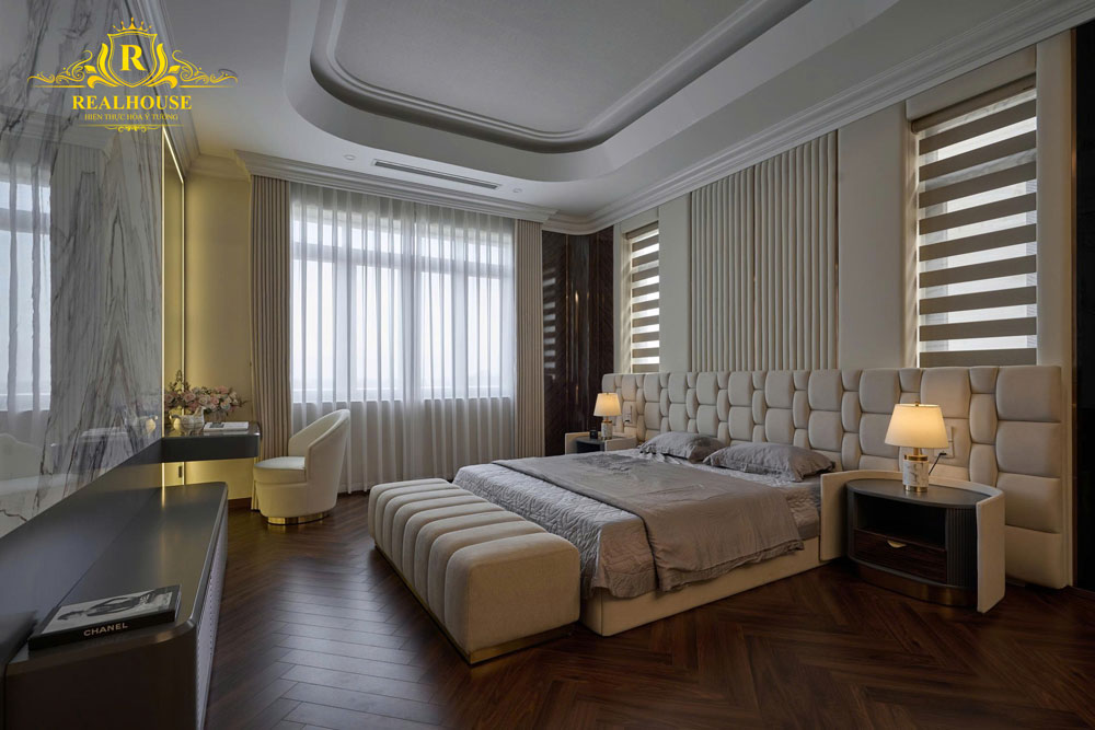 Nếu phòng khách mang đến cảm giác sang trọng và nổi bật, thì phòng ngủ lại là nơi mọi chi tiết được tiết chế để hướng đến sự thư giãn và riêng tư. Không gian nghỉ ngơi được thiết kế với tông màu kem kết hợp nâu gỗ, tạo nên cảm giác nhẹ nhàng và dễ chịu ngay khi bước vào.