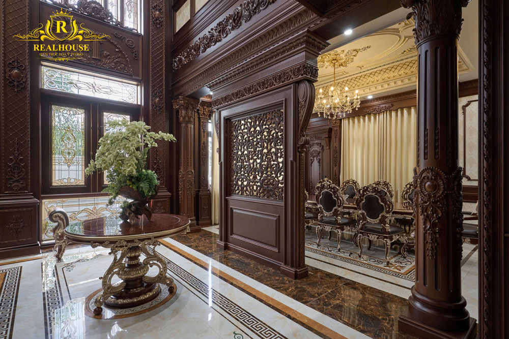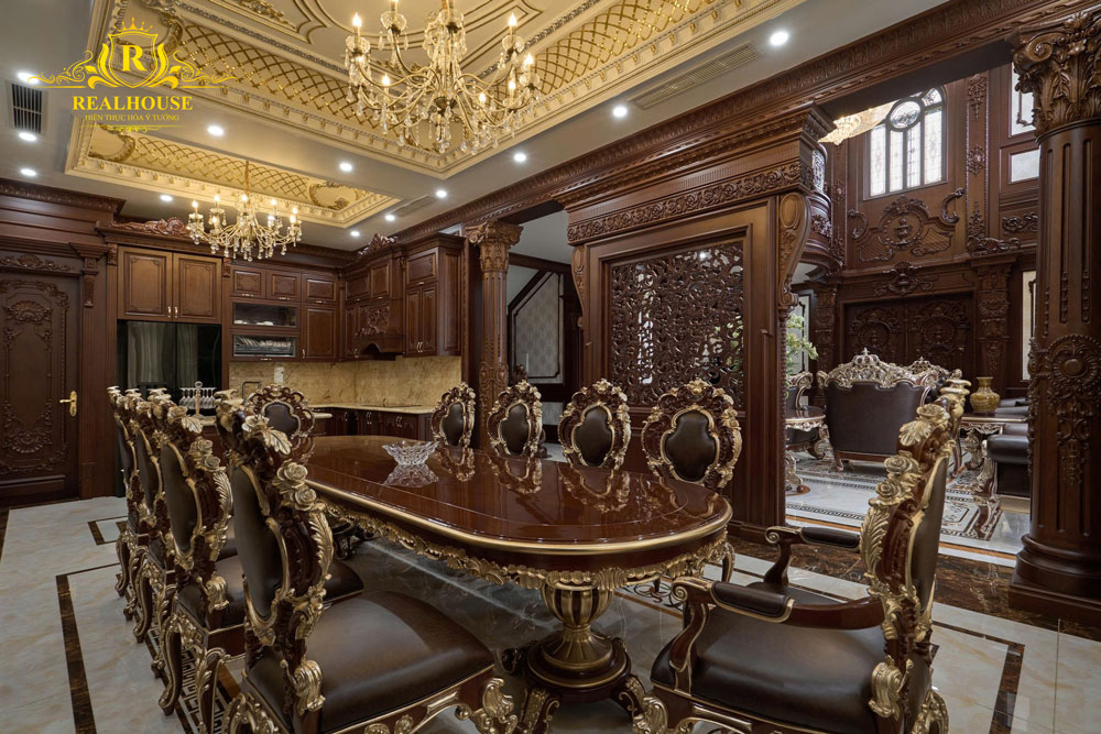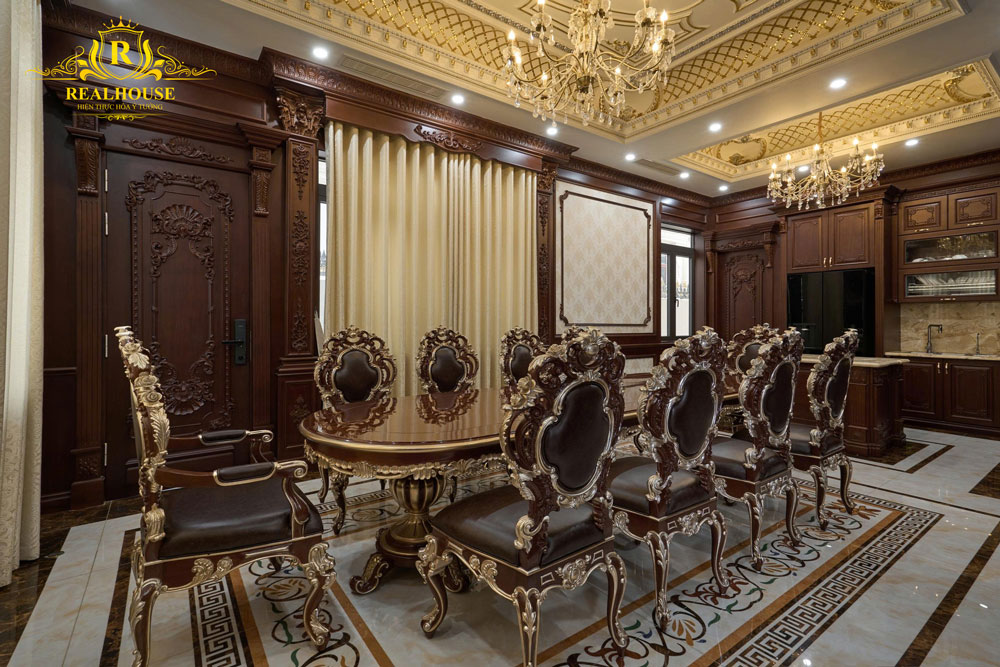 Căn bếp này được Real House thiết kế mang cảm giác như một “bản giao hưởng” của sự xa hoa và tinh xảo, nơi từng chi tiết đều được chăm chút đến mức gần như hoàn mỹ. Gỗ tự nhiên với gam nâu trầm chủ đạo bao phủ toàn bộ hệ tủ và các cột trang trí, tạo nên cảm giác ấm cúng nhưng vẫn đầy quyền quý. Những đường chạm khắc cầu kỳ trên ghế, vách ngăn và tủ bếp tạo nên chiều sâu nghệ thuật, gợi nhắc đến phong cách cổ điển châu Âu sang trọng.