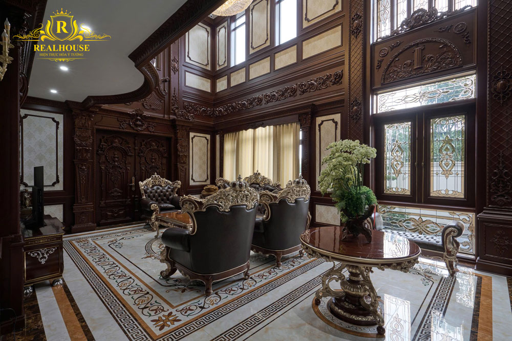 Hệ tường sử dụng gỗ gõ đỏ cao cấp, mang lại cảm giác chắc chắn và ấm áp. Đi cùng là các đường phào chỉ mạ vàng tinh tế, giúp không gian trở nên sang trọng nhưng không quá nặng nề. Ở giữa phòng là bộ sofa Tân cổ điển với khung gỗ chạm khắc thủ công, bọc da cao cấp, vừa đẹp mắt vừa mang lại sự thoải mái khi sử dụng.